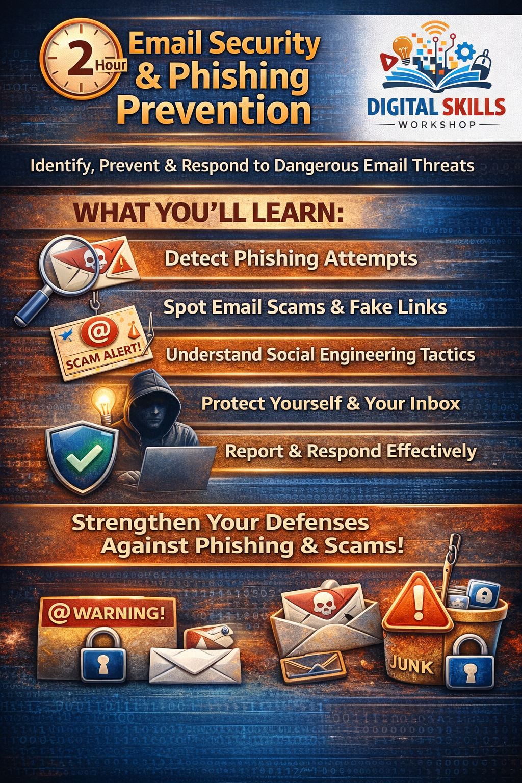 This workshop helps participants confidently identify, avoid, and respond to phishing, scams, and suspicious email activity. Through real examples and practical guidance, attendees learn how cybercriminals trick users, how to spot warning signs, and how to protect both personal and workplace email accounts.